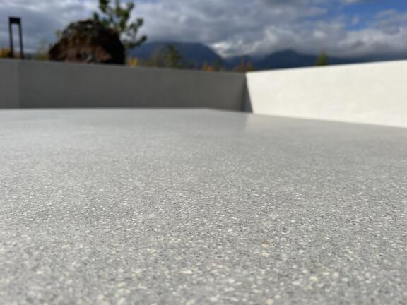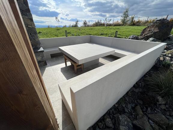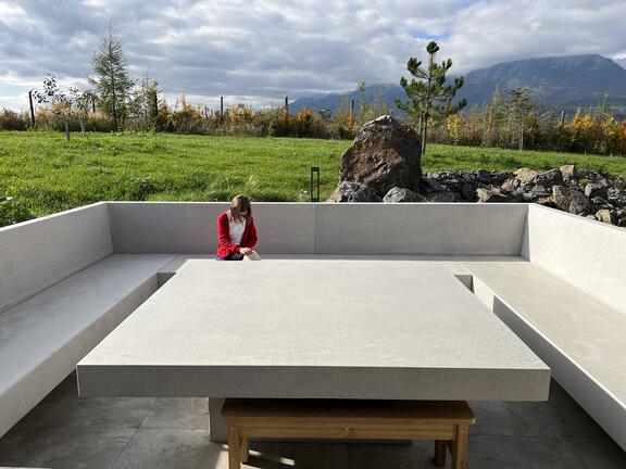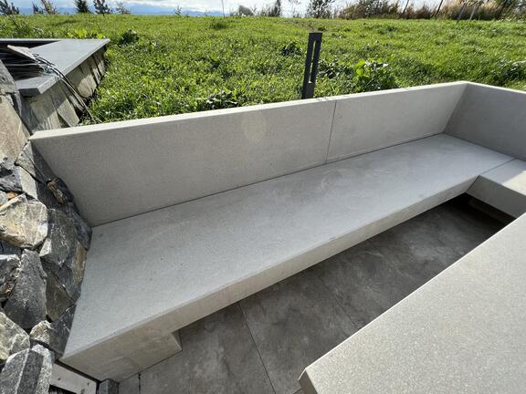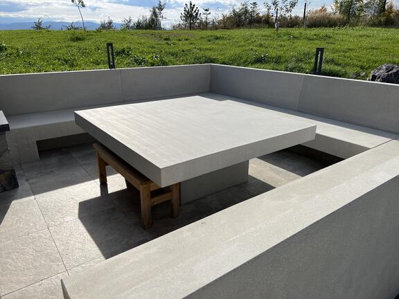 Екстериорът на една семейна къща се допълва от нашите продукти, изработени по поръчка. За този проект доставихме масивна маса и масивни места за сядане, изработени от полиран сив бетон.
