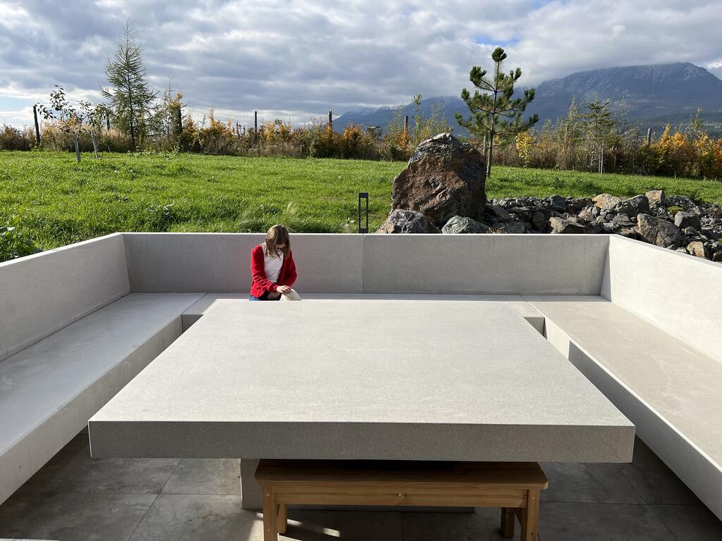 Маса и места за сядане, изработени от полиран сив бетон